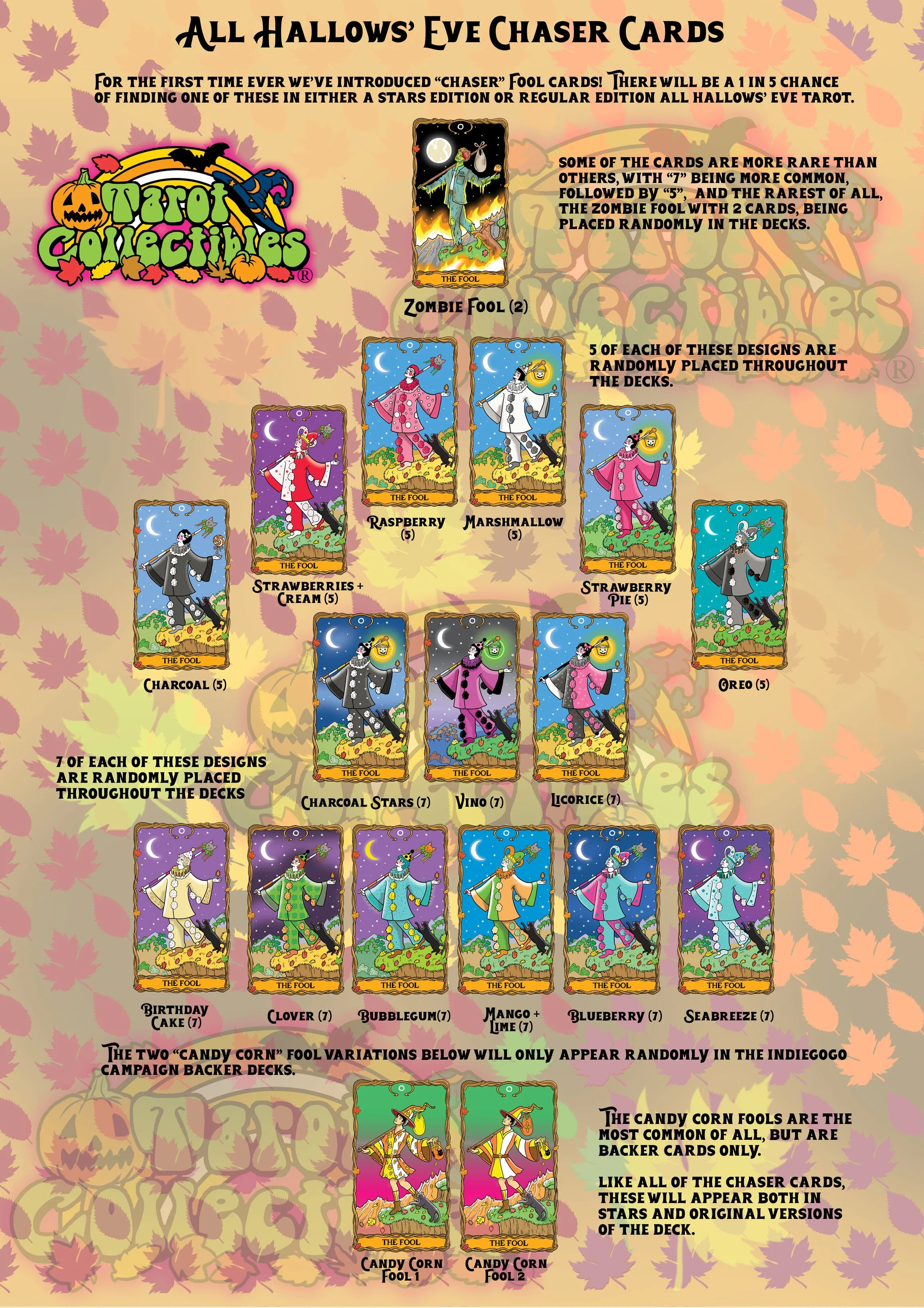 For the first time ever we decided on adding “Chaser” Cards to the All Hallows’ Eve Tarot. We’re always open to new ideas, and this was one that Christine’s daughter, Abigail, suggested. Now I’ve got to be honest; I had never actually heard of a “Chaser” before, but I was happy to be informed. It’s something new, and I really liked the idea, so we went with it. They are all Fool variant cards, with some having different costume changes, and others, like the very rare Zombie fool, being a completely new artwork. I have my own favorites from this lot, for example “Blueberry” and “Licorice” but I think they all have something nice about them. As a team we all came up with the ideas, designs and illustrations and it was a lot of fun to do something extra special for the deck.